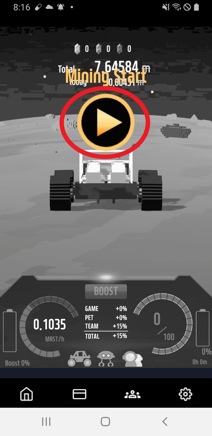 유저가 채굴 앱 메인화면에 접속하면 "재생"버튼을 통해 기본 채굴 (100%) 채굴을 시작할 수 있습니다.