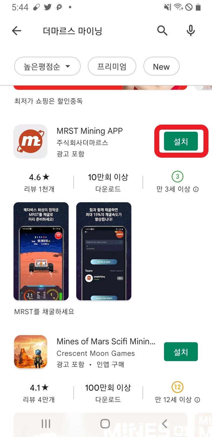 구글 플레이 및 앱스토어에서 더마르스 마이닝을 검색하고 설치를 클릭하세요