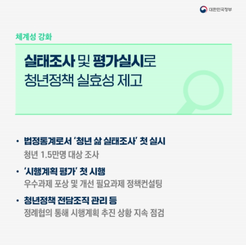 문재인정부는 청년정책을 제도화한 첫 정부로 5개년 법정계획인 제1차 청년정책 기본계획(2021~2025)을 최초로 수립하고 이를 바탕으로 연도별 청년정책 시행계획을 추진 중입니다.