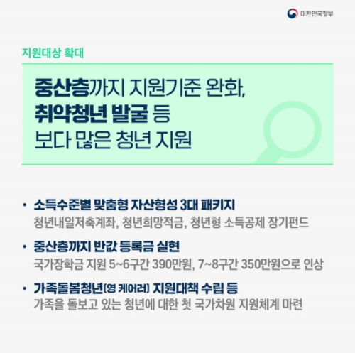복지 분야에서는 연소득 2400만원 이하 청년들에게 지원하는 청년내일저축계좌 대상을 1만 8000명에서 10만명 수준으로 늘리고 연소득 3600만원 이하의 청년을 대상으로 한 청년희망적금 등의 신설을 통해 맞춤형 자산형성을 지원합니다.