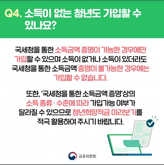 A. 직전년도(2021년 1월~12월) 과세기간의 소득은 2022년 7월경 확정되기 때문에 ‘청년희망적금 미리보기’를 통한 소득요건은 전전년도(2020년 1월~12월) 과세기간 소득을 기준으로 판단합니다.