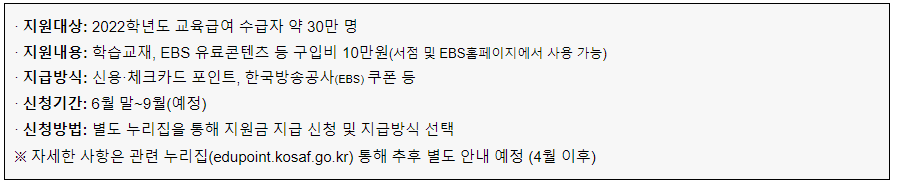 아울러, 2022학년도 교육급여 지원 학생에게는 코로나19 상황을 고려하여 저소득층 학생의 학습결손 완화를 위한 ‘교육급여 학습특별지원금(2022년 한시)’을 별도 신청(6월말 예정)을 통해 하반기에 추가로 지원할 예정입니다.